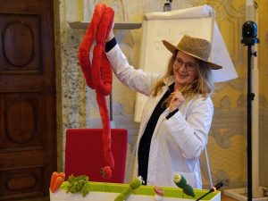 Poté se slova ujaly Marie Pražáková a Eliška Zgarbová a předvedly své prezentace, kterými zaujaly na soutěžích Falling Walls Lab a FameLab (psali jsme zde, resp. zde). Zatímco Marie Pražáková, jejíž práci podporuje Nadační fond UP i letos, své vystoupení o nových koordinačních sloučeninách s manganem a jejich využití v medicíně vystřihla v angličtině a s „klasickým“ slidem v zádech, Eliška Zgarbová, která je již úspěšnou absolventkou přírodovědecké fakulty a před nedávnem obdržela cenu MŠMT (viz tento článek), přirovnala svůj výzkum zaměřený na střevní záněty k zahradničení a z truhlíku s plyšovou zeleninou „sklidila“ plyšové střevo.
